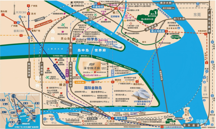为实现大湾区城市会客厅的畅联,项目北侧打造过江人行桥(规划中),东侧打造过江隧道,实现明珠湾金融岛、科学岛的双岛资源共享,打造湾区中央商务区;深业颐泽府作为国际金融岛唯一“府”系备案项目,坐拥双岛繁华配套,实至名归的“岛中岛 世界府”。