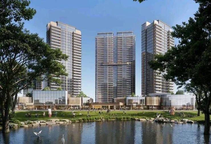 三江汇流的自然景观是项目的天然底色,社区内部则以新中式园林为骨架,构建 “锦鲤鱼池 — 揽江水苑 — 阳光草坪 — 林间观湖” 的景观轴线。