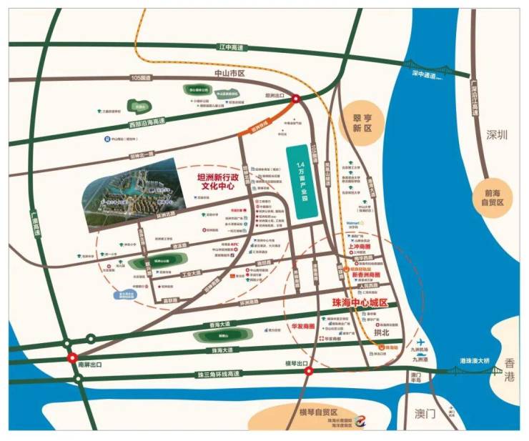 首先,项目位于中山城市副中心南部新城(规划中,来源:中山发布),靠近坦洲新行政中心,与珠海密切相连,发展潜力“左右逢迎”。