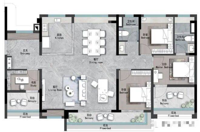 :4空间二厅三卫,宽敞舒适,功能分区明确。
