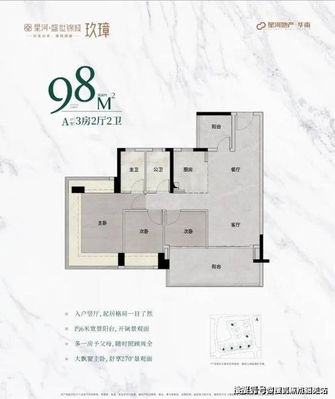 得房率98%-100%:新规户型赠送面积显著增加,98㎡三房实得面积超96㎡。