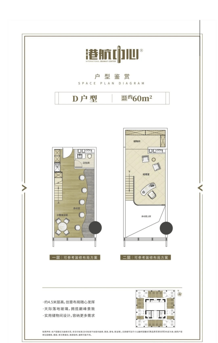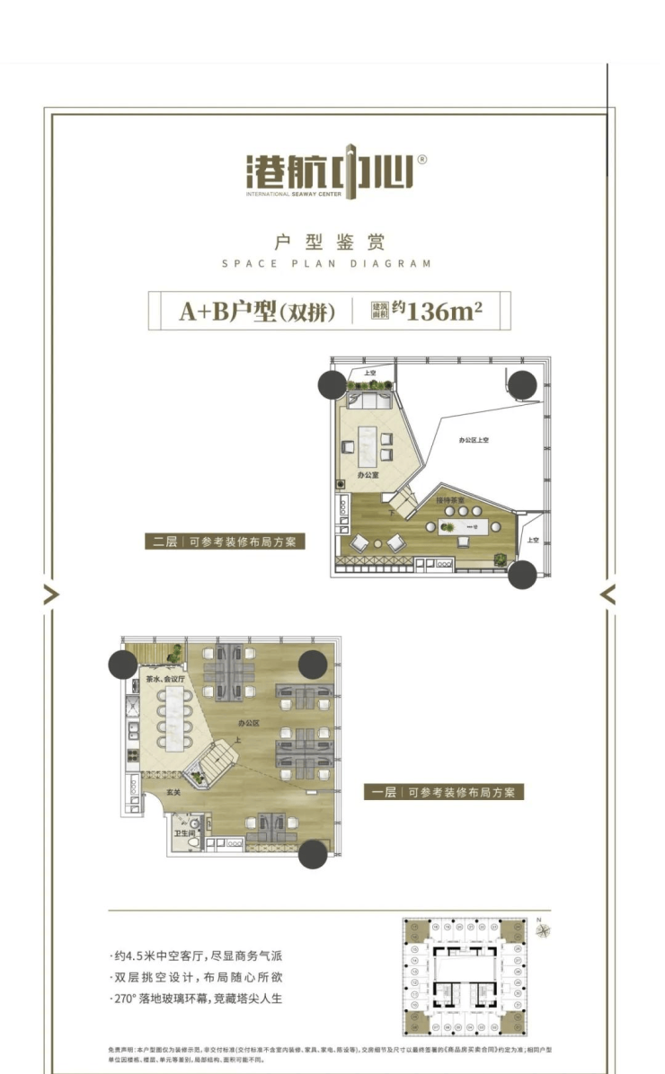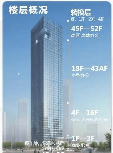 每层层高:4.5米(1楼约16米高豪华办公大堂,46层配备18米挑高瞰江空中花园)