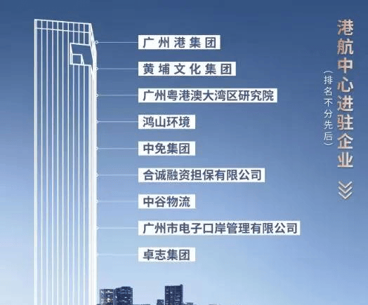 企业——项目进驻企业有广州港集团、中免集团、中谷物流、卓志集团、黄埔文化集团、广州粤港澳大湾区研究院等航运、跨境电商物流等龙头企业;广州第二CBD临港经济区启动片区,共享资源,助推企业加速发展。