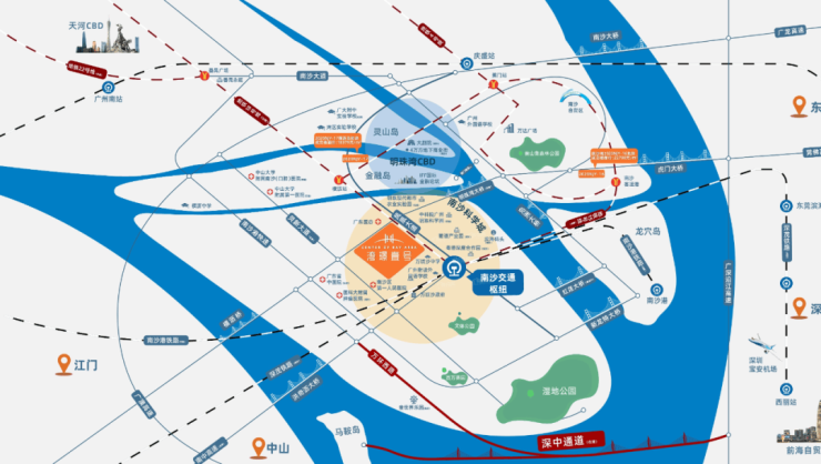 项目地处南沙枢纽区块,占位粤港深度合作区、万顷沙综合生活服务区核芯,紧靠片区内商业中心(规划),紧邻广州地铁18号线万顷沙站、深中通道、明珠湾大桥,揽两横四纵干道、六高速八轨道立体交通,深圳宝安中心,畅享湾区内环快捷通勤,一揽南沙、番禺、天河商业配套,同时更享明珠湾发展红利。