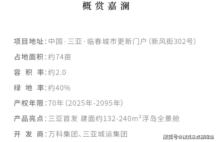 【概赏嘉澜ABOUT GALAND】◎项目地址:中国·三亚·临春城市更新门户(新风街302号)◎占地面积:约74亩◎容积率:约2.0◎绿地率:约40%◎产权年限:70年(2025年-2095年)◎产品面积:建面约132m²、156m²、180m²、210m²、240m²,共603席◎开发商:万科集团、三亚城运集团