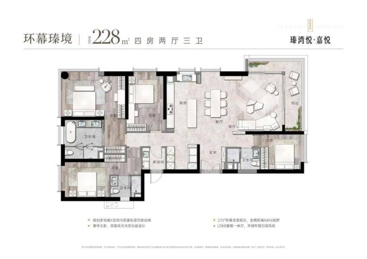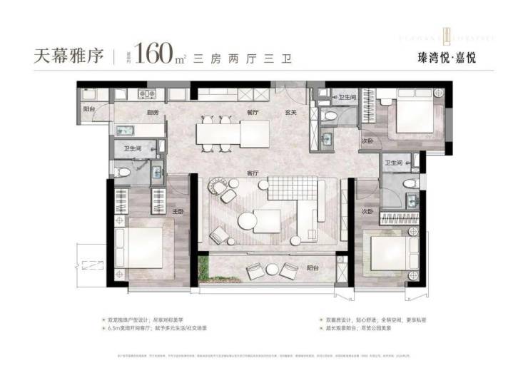 户型面积:公寓户型为约160平方米三房两厅三卫和约228平方米四房两厅三卫。