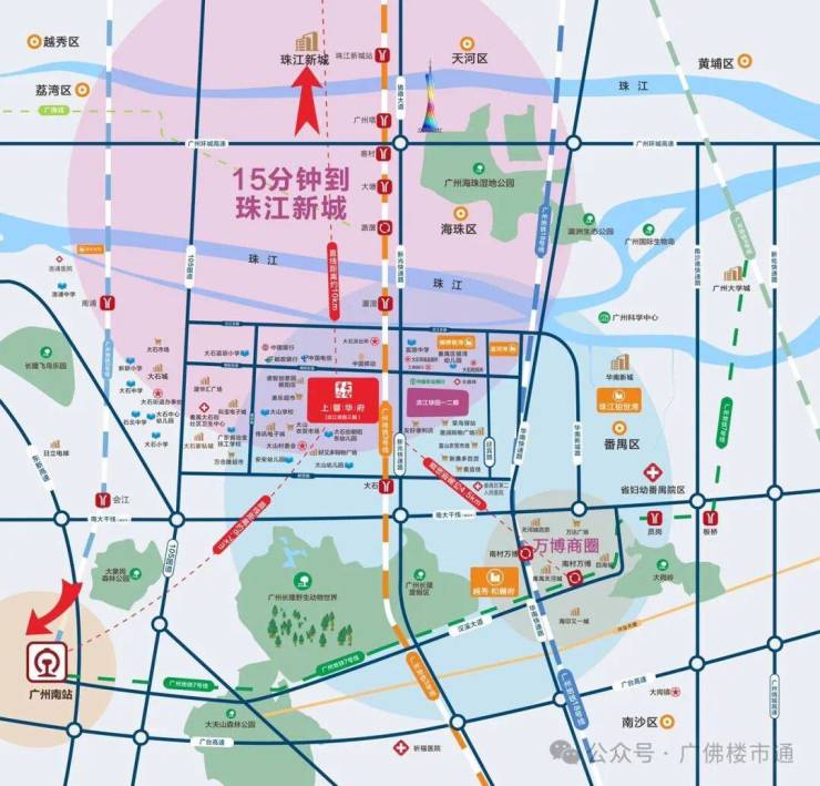 地铁3号线|黄金大动脉3号线大石站,约900米,2站万博CBD/海珠,6站达珠江新城/琶洲。