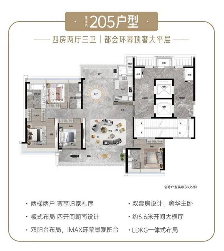 205㎡四房两厅三卫是环幕景观户型,配备近 9 米宽的巨幕双阳台,双主卧套房设计,长辈房带独立卫浴,避免日常起居干扰。