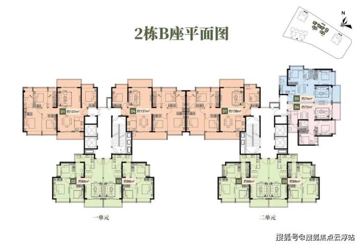 🔹2栋B座一单元01、04户型、2栋B座二单元01户型:面积约为137-138㎡的4房2厅2卫