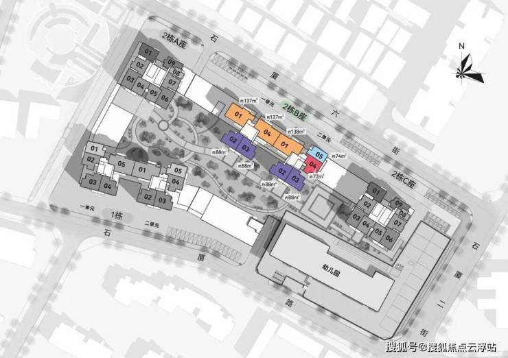 二单元2梯5户:01户型138㎡(4房);02户型88㎡(3房);03户型88㎡(3房);04户型72㎡(2房);05户型74㎡(2房)