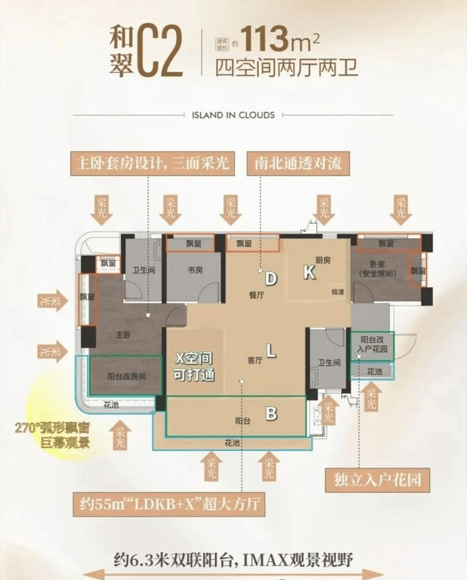 如果是人口较多的家庭,113㎡四房两卫会更合适。这个户型可以灵活改造,比如把其中一个房间改成书房或储物间,满足不同阶段的需求。客厅连接着6.3米的景观阳台,高层单位站在这里能看到无遮挡的江景和城市天际线,视野开阔。该户型目前总价在488万到600万之间,单价约4.3万/㎡,对于想在海珠一步到位的家庭来说,是个不错的选择。