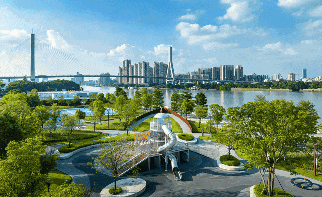 项目约18万m2广船滨江公园,配套儿童公园、大草坪、羽毛球场、篮球场等,下楼即可享受运动,野营,跑步等娱乐休闲方式,东西延续到广钢原址公园,构成超60万m2的T型城市绿轴。