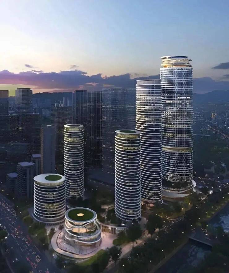 广州「鹏瑞一号」占地约5.42万㎡,共规划有六栋圆柱外型建筑,包含1号公寓、奢华酒店、高端定制商业、艺术中心、广州深湾会、停机坪等复合业态。