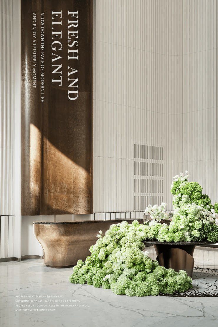 “自然东方”的理念贯穿鹏瑞一号的公共空间。这里的自然,并非装饰意义上的绿植堆叠,而是一种被高度提炼后的空间哲学。