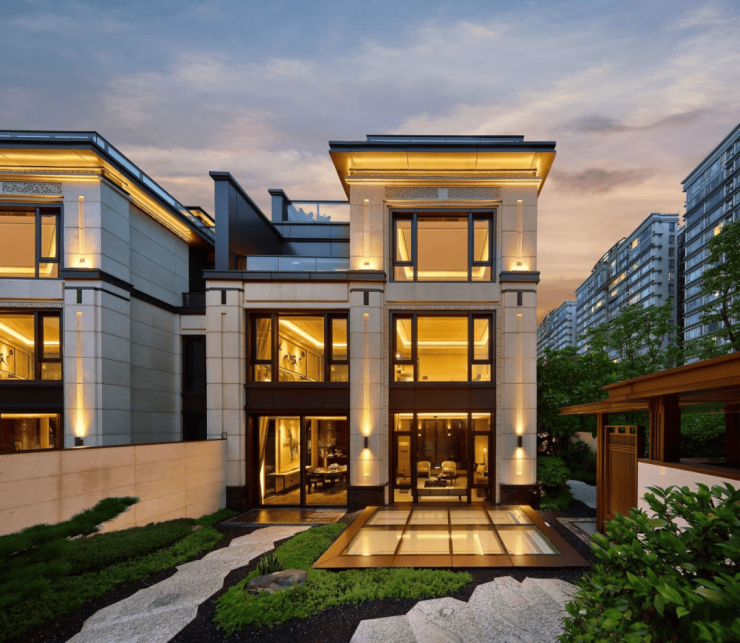 项目取法皇家院落规制,通过威仪府门、镇宅石狮、尊荣门匾、名园造景等方式,将传世家族的威仪展现得淋漓尽致。一府宅门,252颗铜制鎏金“浮沤钉”,开阖磅礴气势;镇宅石狮,采用法国金花干挂天然石材,重达上吨,器宇轩昂;德系品牌 SCHUECO 系统门窗,双层中空 LOW-E 玻璃,营造丰盈与外、安静于内的家族生活。