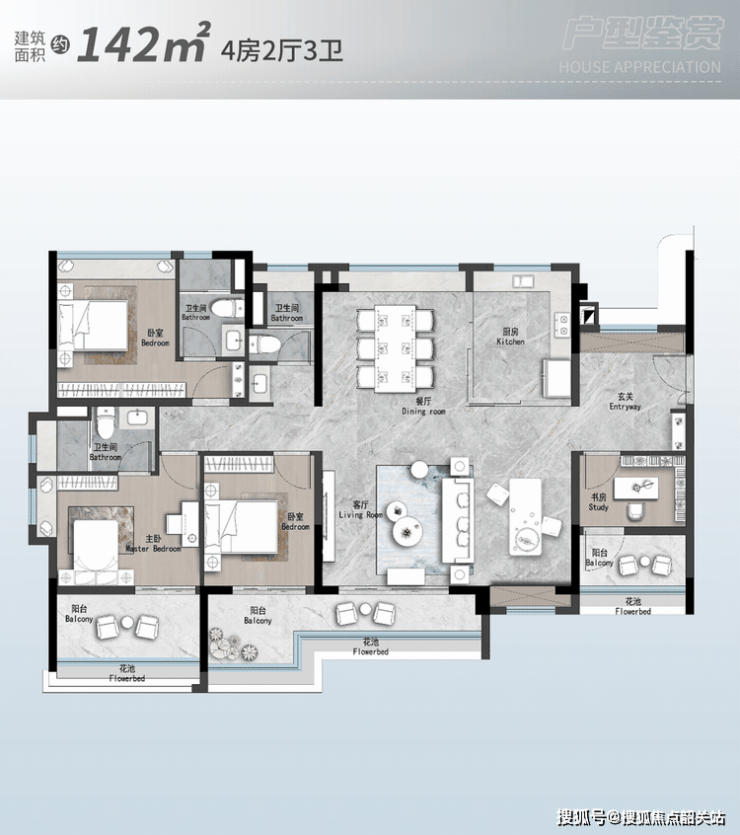 在产品细节上,天河源筑同样展现出对高知家庭生活方式的深刻理解。项目在售建面约91–182㎡的三至四房产品,普遍拥有超105%的使用率,在寸土寸金的天河实属难得。以建面约142㎡户型为例,采用南北通透格局,打造超大LDKB(客厅、餐厅、厨房、阳台一体化)空间,无论是三代同堂日常互动,还是朋友聚会轰趴,都能从容应对。更值得称道的是其双主卧套房设计——既保障了父母与子女的独立私密空间,又兼顾日常照护的便利性,真正实现“亲密有间”的现代家庭关系。