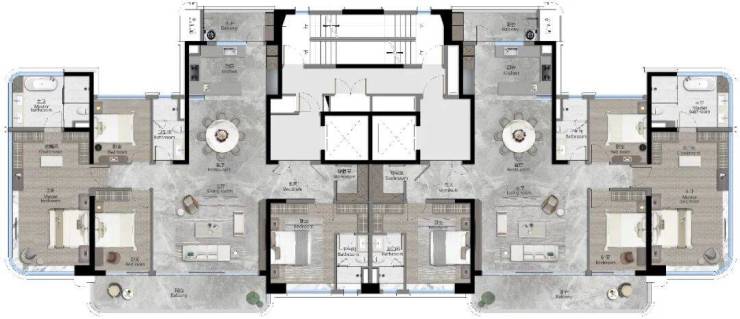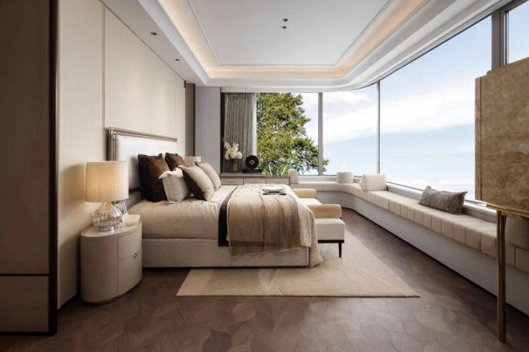 这个户型是四开间朝南的双套房,主卧套房同样是270度的弧面转角窗设计。每一个卫生间,都是自然通风的全明设计。