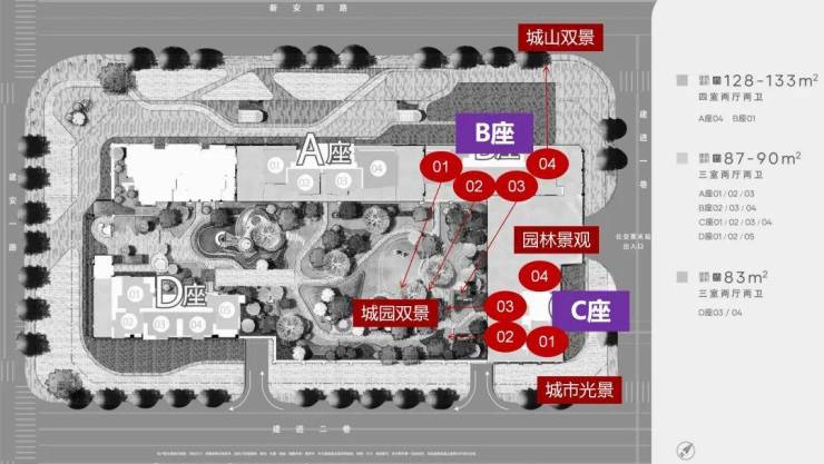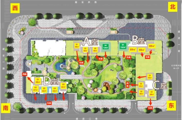 玖玖颂阁占地约1.4万㎡,建面约10.41万㎡,目前在售89㎡3房/128㎡4房。项目由5栋组成,E座为公租房,A~B-C座2梯4户,D座2梯5户, D座有部分回迁房,可售楼层为3-13层。