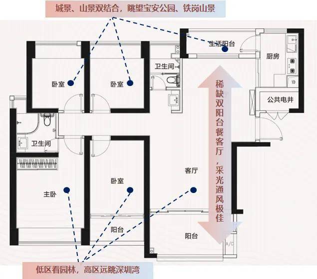 三阳台:前海黄金圈内,唯一在售89㎡三房两卫三阳台,客厅阳台进深2米,堪比140㎡大户型阳台