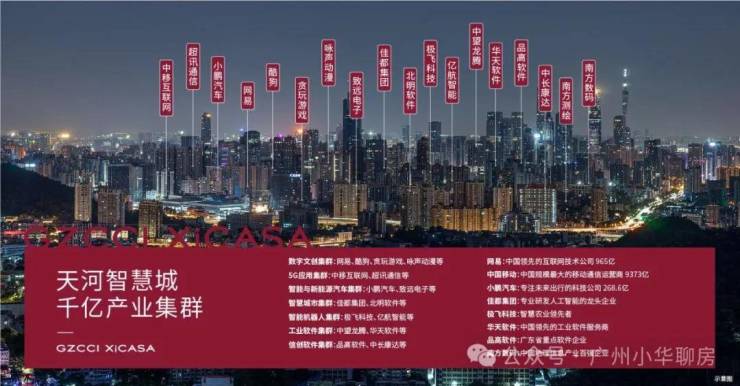 天河智慧城汇聚中国移动、网易、酷狗、小鹏汽车等3000多家科技企业、1000多家高新技术企业,构建八大产业集群,2023年总收入达3226亿元,引进20多万技术人才,“广州硅谷”孕育而生,成为湾区科创精英宜居宜业之地。