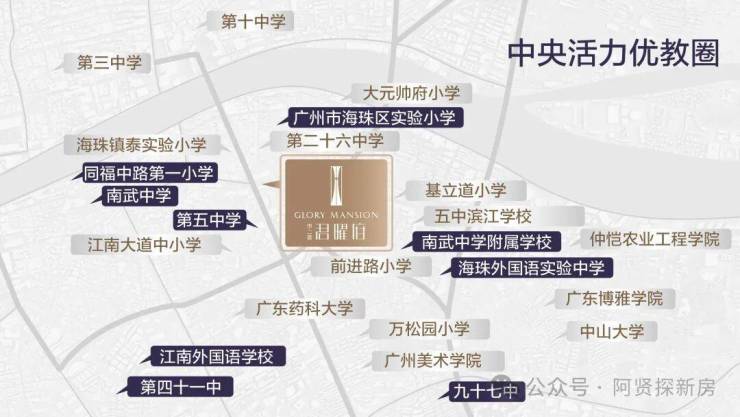 公办省一级海珠区实验小学为邻,对口五中、六中、南武等名校(2024年教育招生公示),周边30余所优质学府林立,划定“中央活力优教圈”,开启海珠菁英教育新时代。(具体招生政策以当年政府教育局公布为准。)
