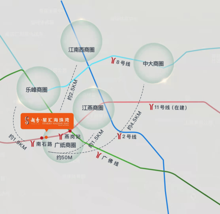 广州11号线(在建)贯穿项目,广州首条环城地铁,0换乘直达琵洲、广州火车站、广州东站;距广佛线燕岗站约450米,接入3号线,7站到达珠江新城;海珠环岛路(在建)工程进度不断刷新,价值即将兑现。