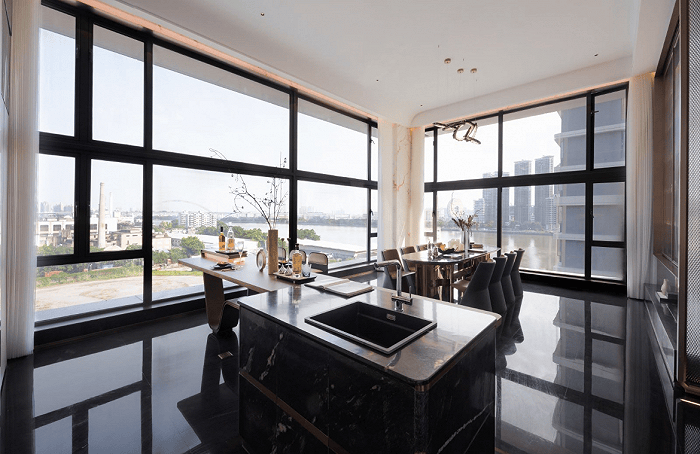 4.5米层高的餐客厅,采用L型的双面落地窗,实现环幕式的江景视野,豪宅的霸气感一览无遗。