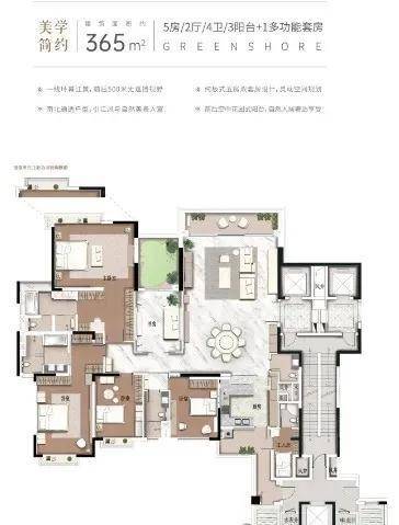 下叠面积为437㎡,花园面积区间约为357-797㎡,实用率229-338%;每个户型均为4+1房设计,最高可做到7房。