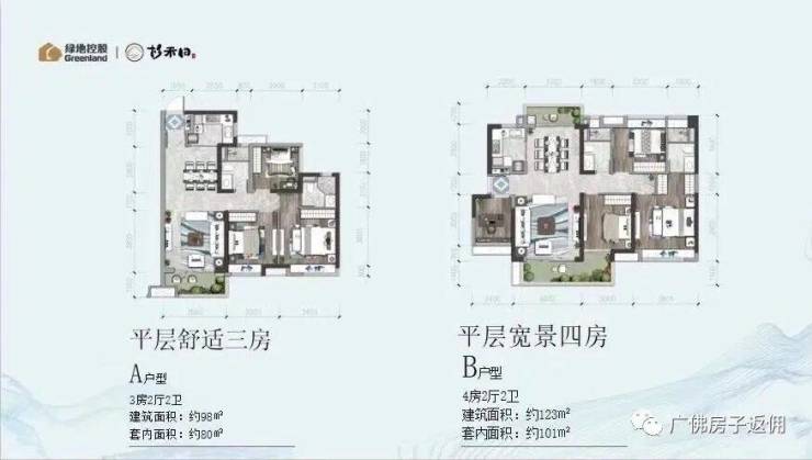 平层洋房,2梯4户,户户朝南,面积约98方3房到123方4房