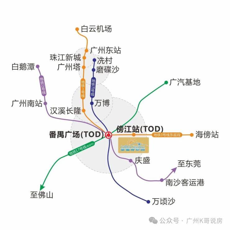 金海岸花园紧邻3号线东延段傍江站TOD,1站直达番禺广场、2站万博CBD、3站广州南站及琶洲、4站即达珠江新城,畅享番禺广场TOD及未来规划发展的经济红利!