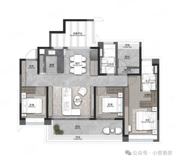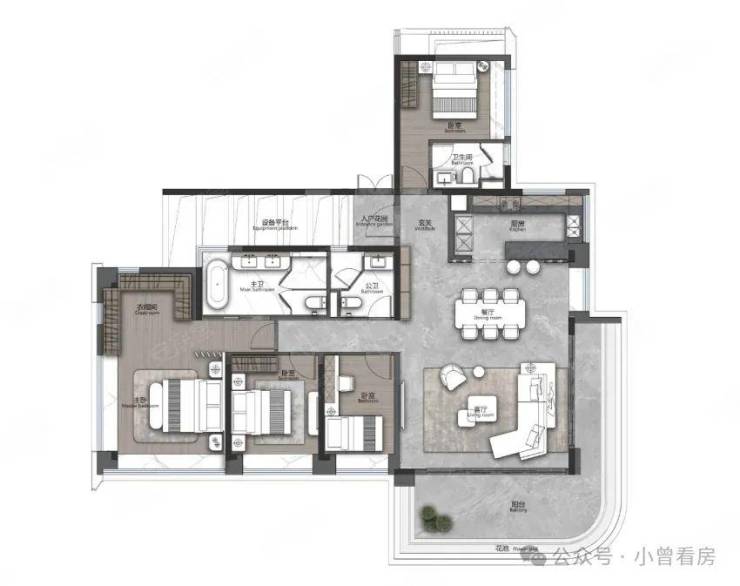 目前在售的户型覆盖刚需到改善需求,得房率超过 100%,每户还配备 5-8㎡的设备平台,相当于额外多出一间房。