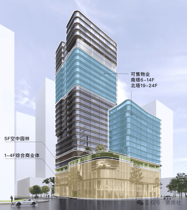 建筑分为南北两座塔楼,楼高约131.9米,270°江幕会客厅、云端总部办公区与新零售体验空间,构成“垂直城市”的立体场景;每一处细节都彰显着对品质生活的极致追求