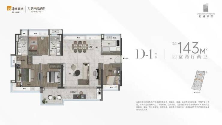 ✅【约8.6m阳台 中轴园景 南北大通厅户型 】D-1户型 143㎡ 四房两厅两卫