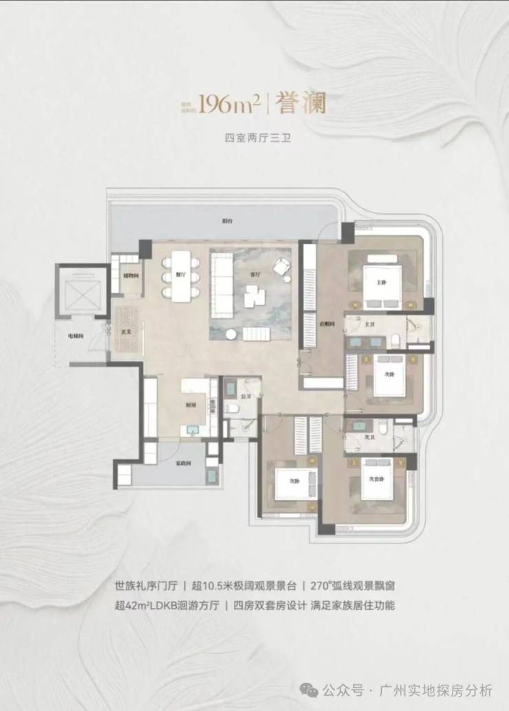 205㎡四室两厅三卫:以42㎡洄游方厅、10.5 米奢阔观景露台为核心,强化空间通透感;