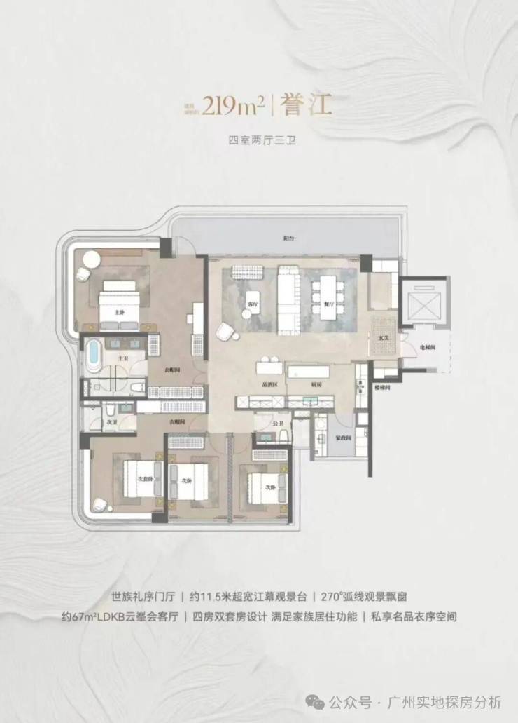 228㎡四室两厅三卫:配约 11.5 米超宽江幕观景台、约67㎡LDKB 云峯会客厅,双套房设计满足家族居需求;