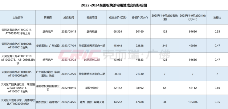 6宗宅地目前已有5宗转化入市,在这其中,华润置地天河润府一期今年1-9月成交349套,成交均价49060元/㎡,地楼比0.47。