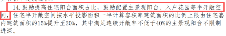 公告还指出,鼓励提高住宅阳台面积占比,鼓励配置主景观阳台、入户花园等半开敞空间。