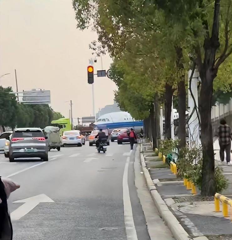 视频中,在道路交叉口附近,往来司机拍到,一架飞机正在岔路口疑似转弯。另一视频显示,该飞机上有“中国南方航空”字样,飞机两侧没有机翼。机身被放置于一货车上。
