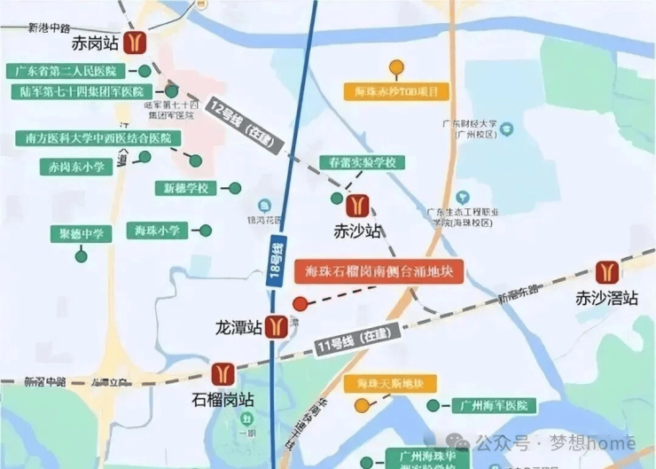 项目坐落于广州中心城区海珠区之心,华洲路旁,西侧为广州海珠湿地公园,南侧邻石榴岗河,距离地铁11号线(在建)和18号线换乘的石榴岗站约1200米,距离琶洲南TOD不到两公里。