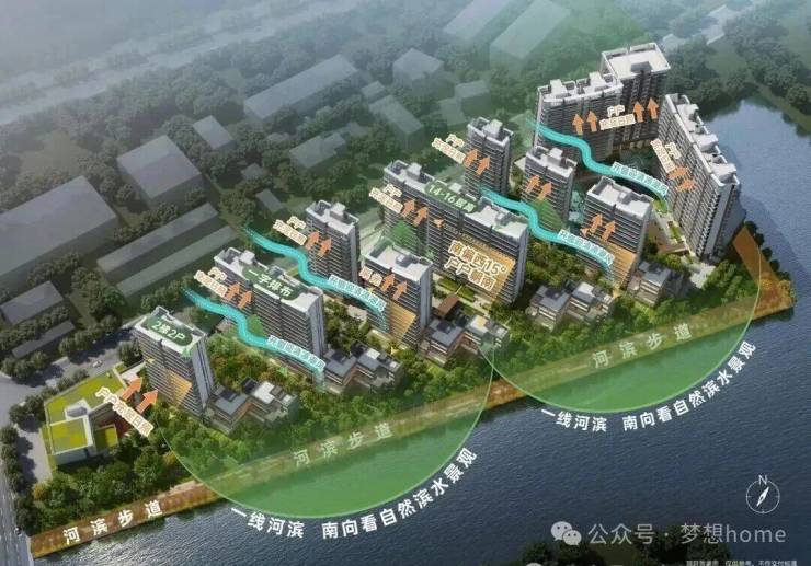 产品主要以小高层和叠墅为主,其中16栋为14-16层的小高层住宅,5栋临河的4层叠墅。由于临近军区的原因,所以朝向不是正南,而是偏西南,小区设计南低北高,东侧的临河位置由于限高15米,做了5栋4层高叠墅,西侧也是小高层15-16层设计。