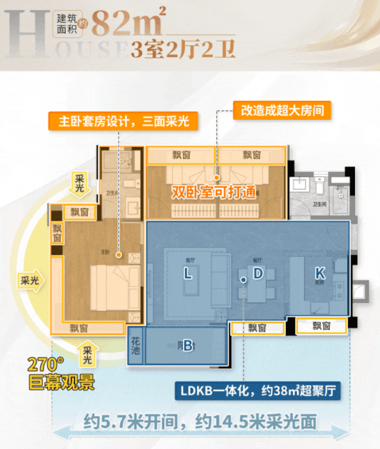 82㎡三房两卫:南北对流,LDKB一体化设计,270度超大角度采光。