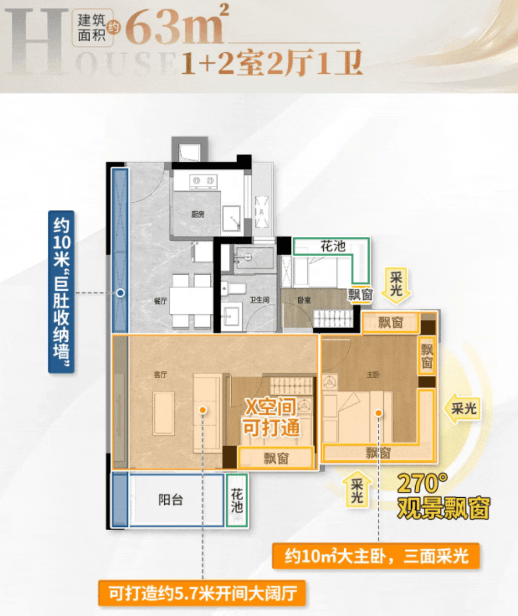 63㎡三房两厅一卫:最高达107%实用率,主卧U型全景飘窗,三江汇聚景观面更佳。