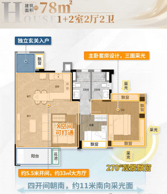 77㎡三房两厅两卫:四开间朝南,超11米南向采光面,豪华大主卧设计。