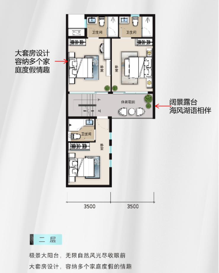 别墅小院:约80㎡海边小院,5房5卫套房设计,有天有地有院子和看海露台!