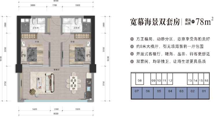 高层期房:约78㎡海景双主套房, 8米横厅宽幕,一线海景!