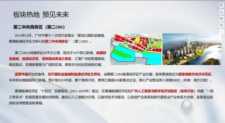 第二CBD占地面积达59平方公里,相当于10个珠江新城,由国际金融城、临港经济区、琶洲形成黄金三角区,是广州发展前景最为广阔的区域,