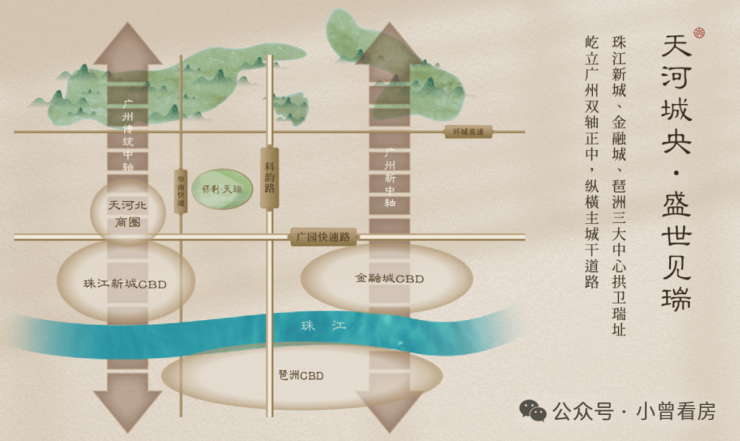 项目位于天河五山汇景新城板块内,珠江新城和琶洲金融城两中轴间的核心位置,楼盘身后就是汇景20年醇熟的圈层配套