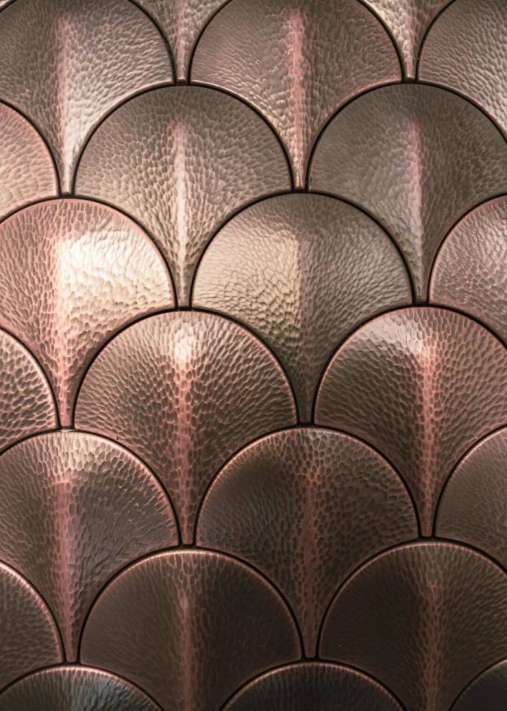 比如崇门厅,数百块铜片手工拼叠的“海潮”背景墙,从海潮永恒涌动的寓意中,传达出了家族兴旺的愿望。