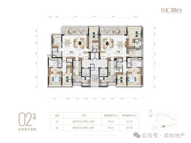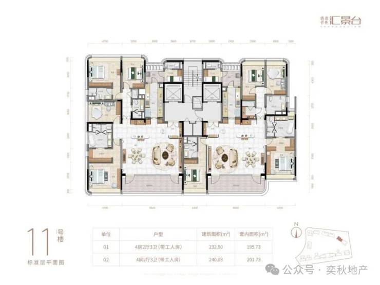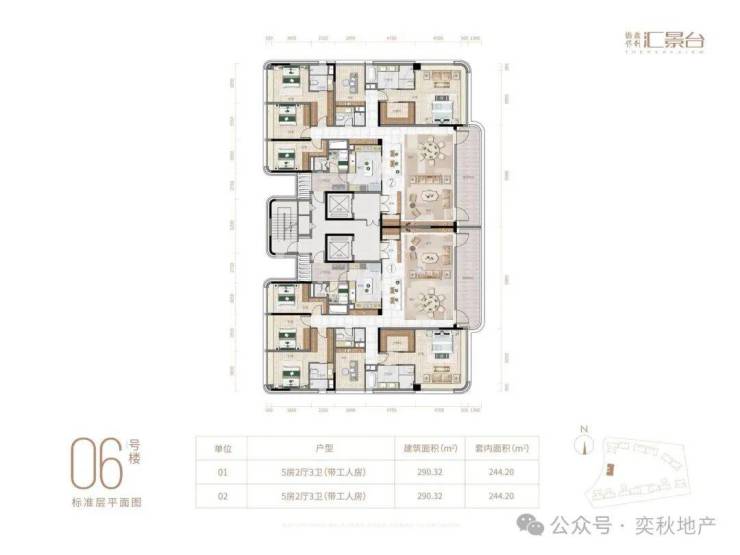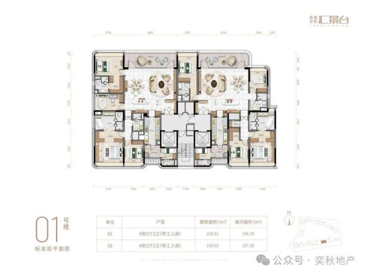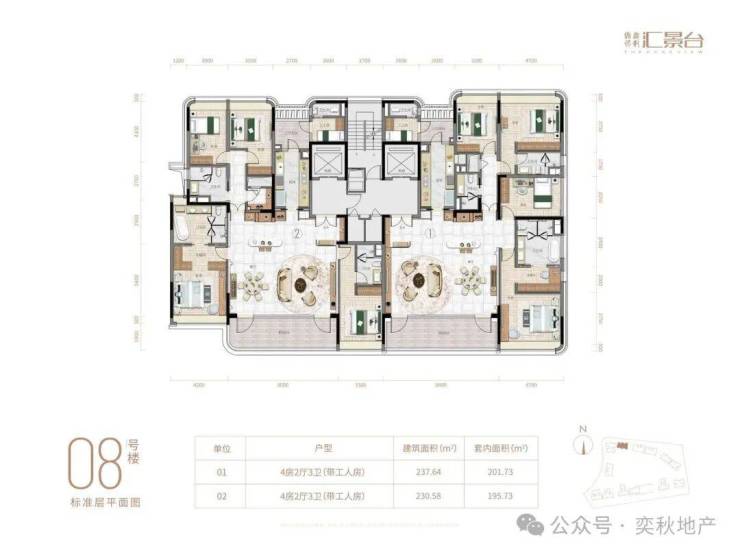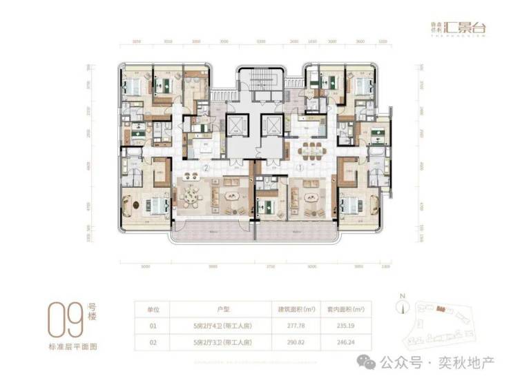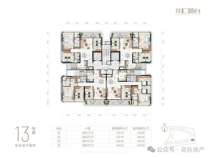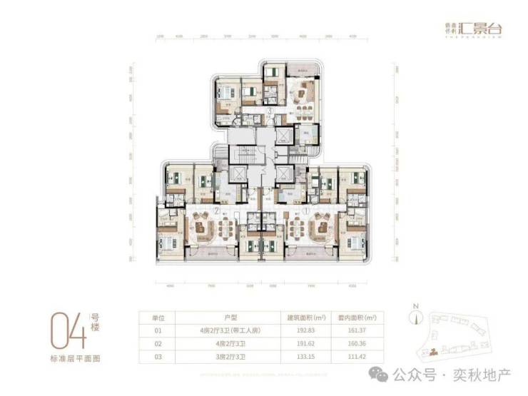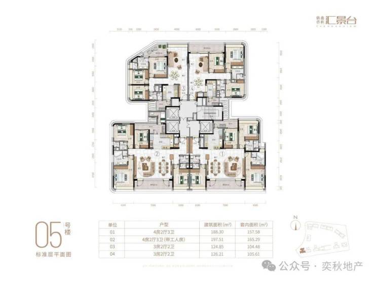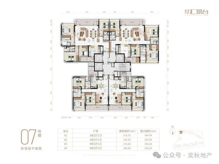 项目由14栋12层小高层组成,产品涵盖123-352㎡三至五房,共8类户型,户型实用率约82-84%