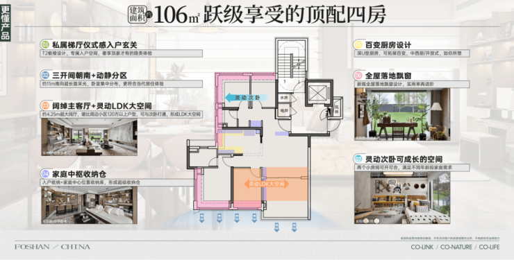 :小面积大空间,超百使用率,同等面积乐享更大空间。全户型南北通透、户户朝阳,阳光与风景平权。LDGK 一体超宽开间,融汇家人多种幸福生活方式,满足小家庭对品质生活的追求。